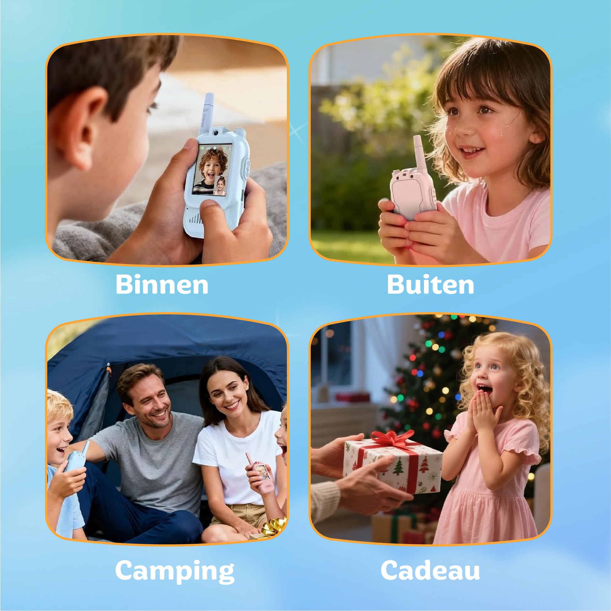 Kinderen willen een “cool gadget” en ouders willen vooral: minder schermtijd, minder gedoe en wél contact. Video + audio voelt als een upgrade ten opzichte van gewone walkietalkies: horen is leuk, maar zien maakt het spel veel echter. En omdat je geen telefoon, app of internet nodig hebt, is het juist buitenshuis praktisch.