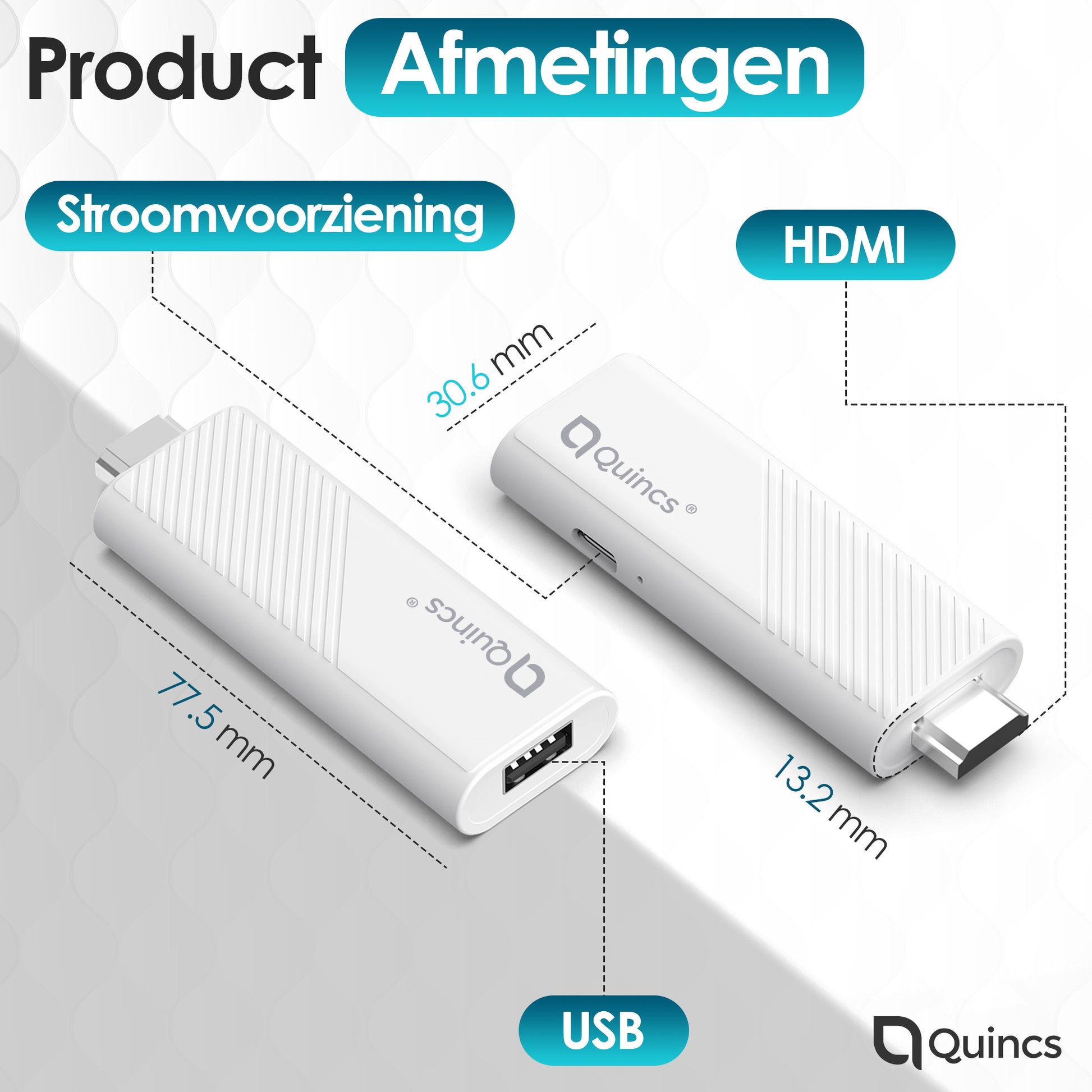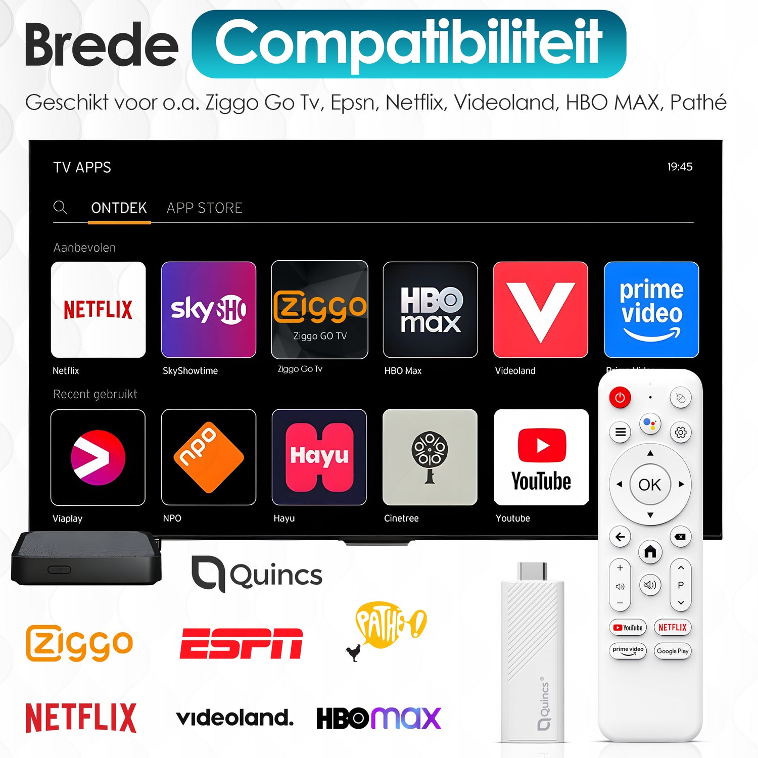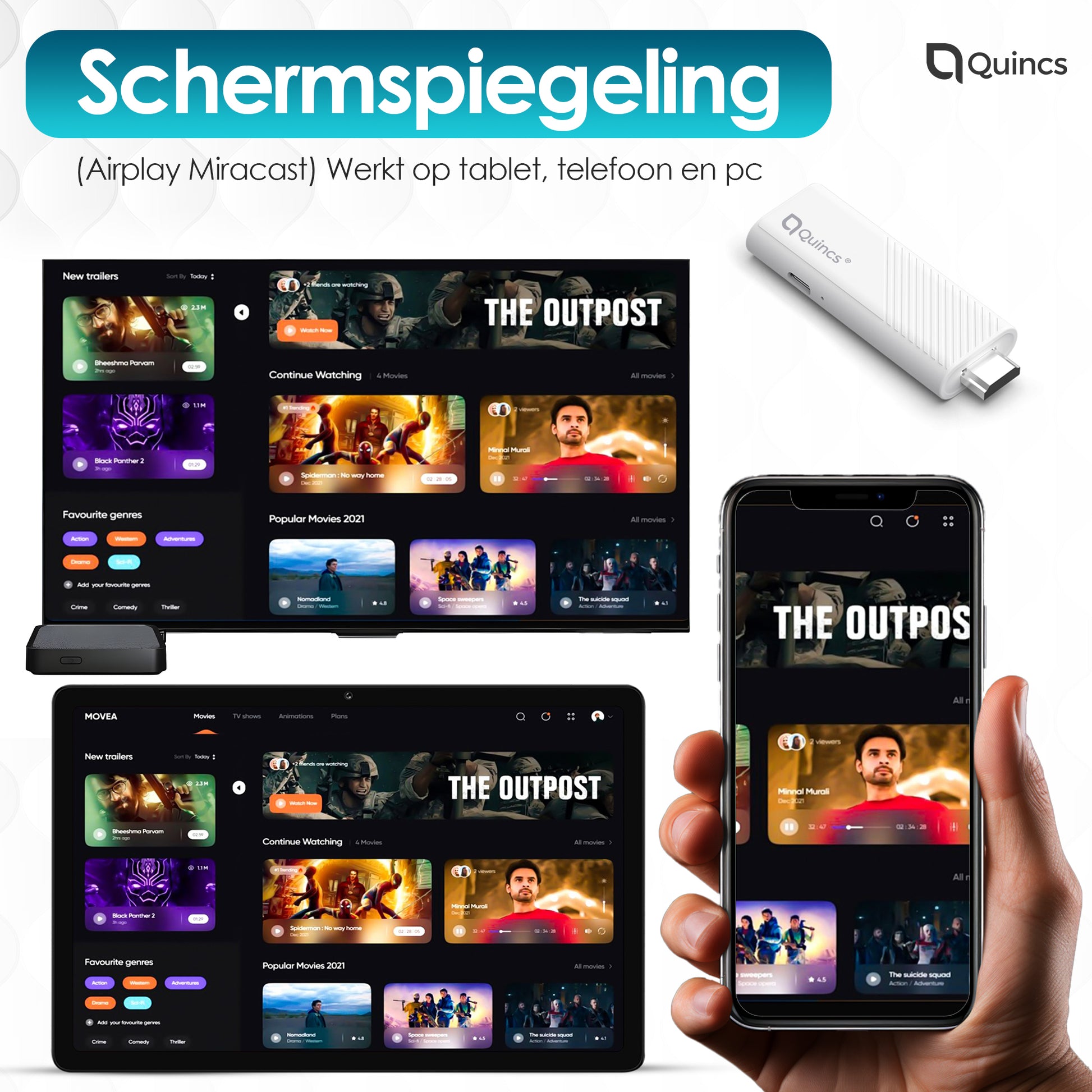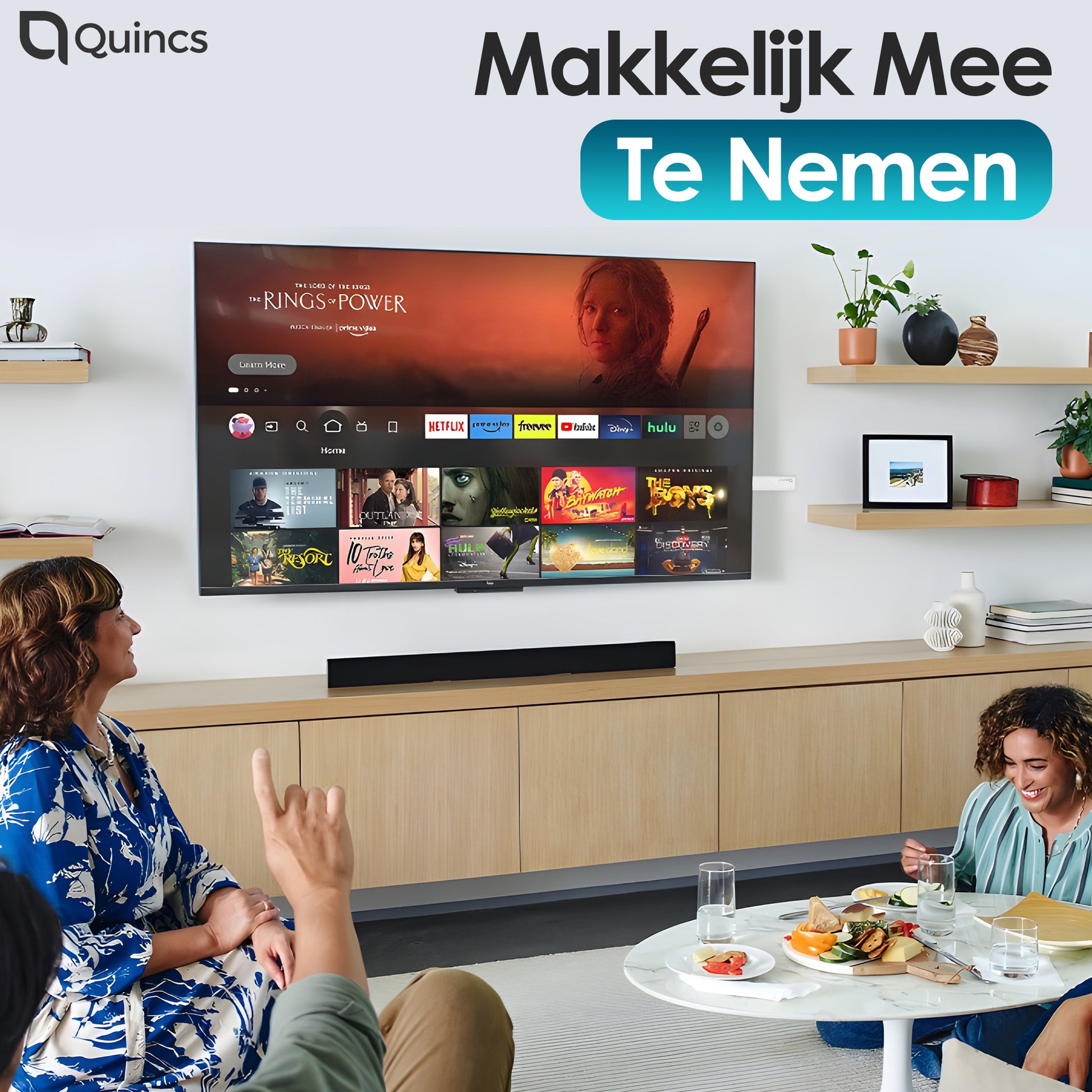 Met de Quincs TV Stick verander je elke tv in een smart tv. Binnen een paar minuten stream je Netflix, YouTube en meer zonder extra kosten. Compact, snel en eenvoudig te gebruiken, ook onderweg.